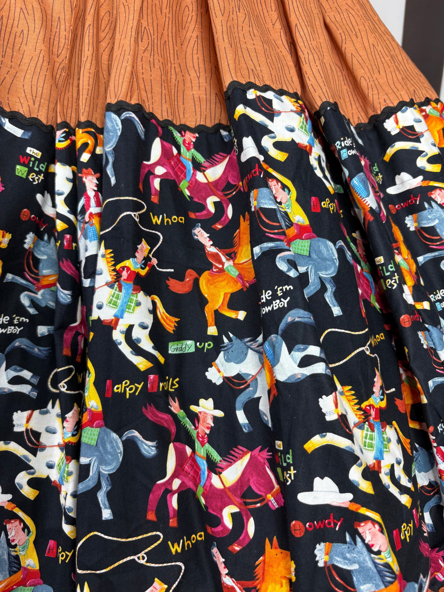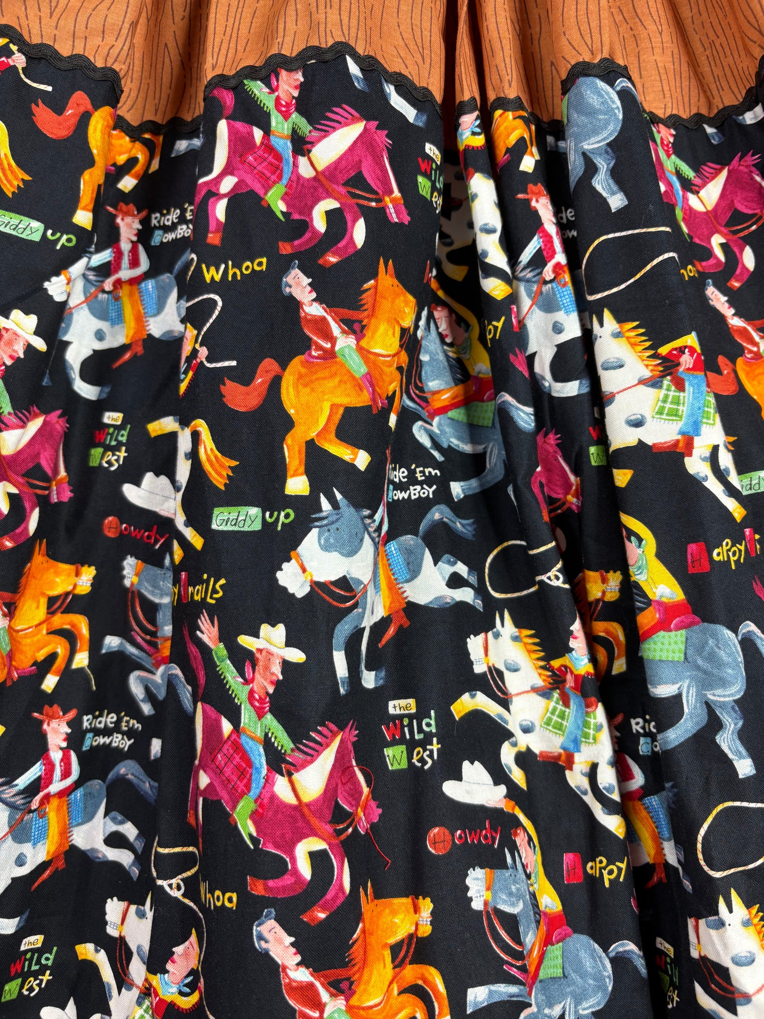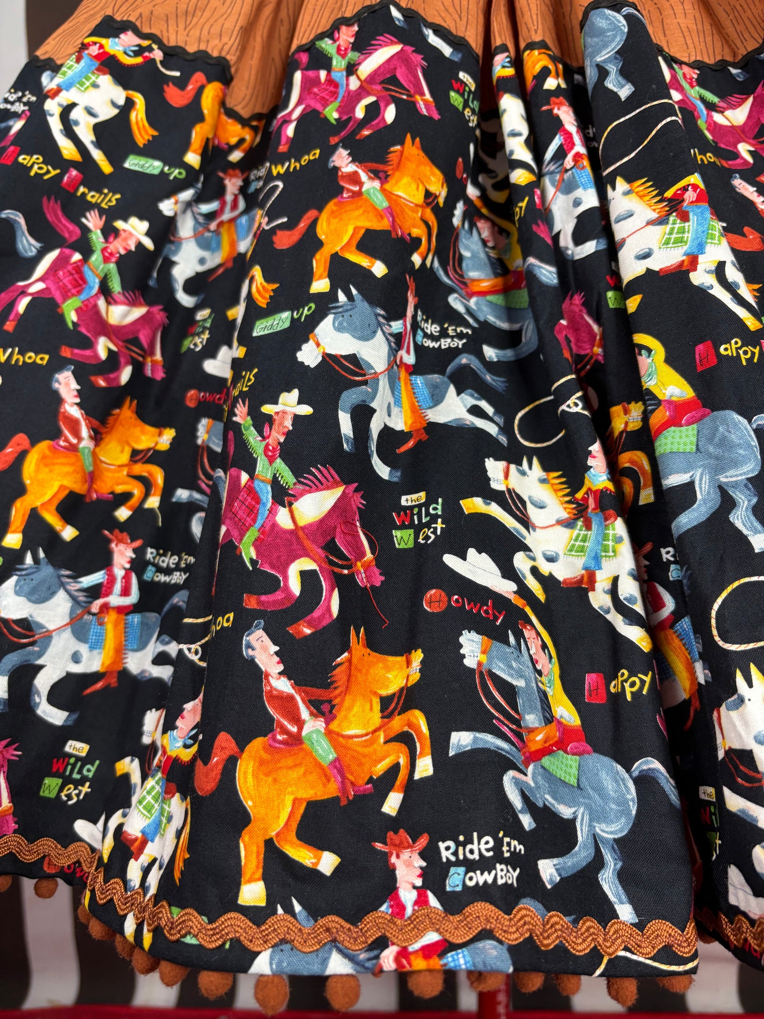 A quality 💯 out of print cotton fabric featuring carton like illustrations of cowboys on their horses with a black background & perfectly co ordinated brown wood print cotton fabric then finished off with black ric rac on the top boarder & a caramel ric rac and mini pom poms on the hemline!