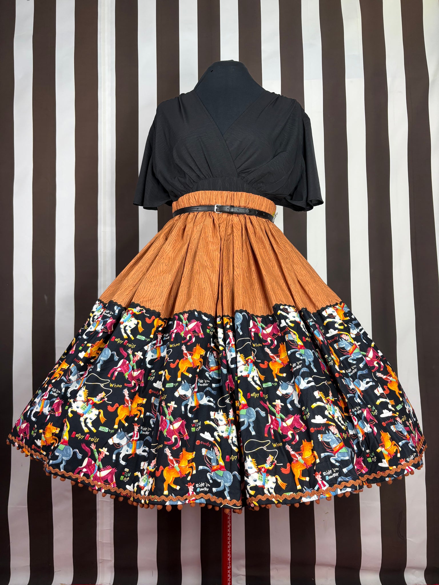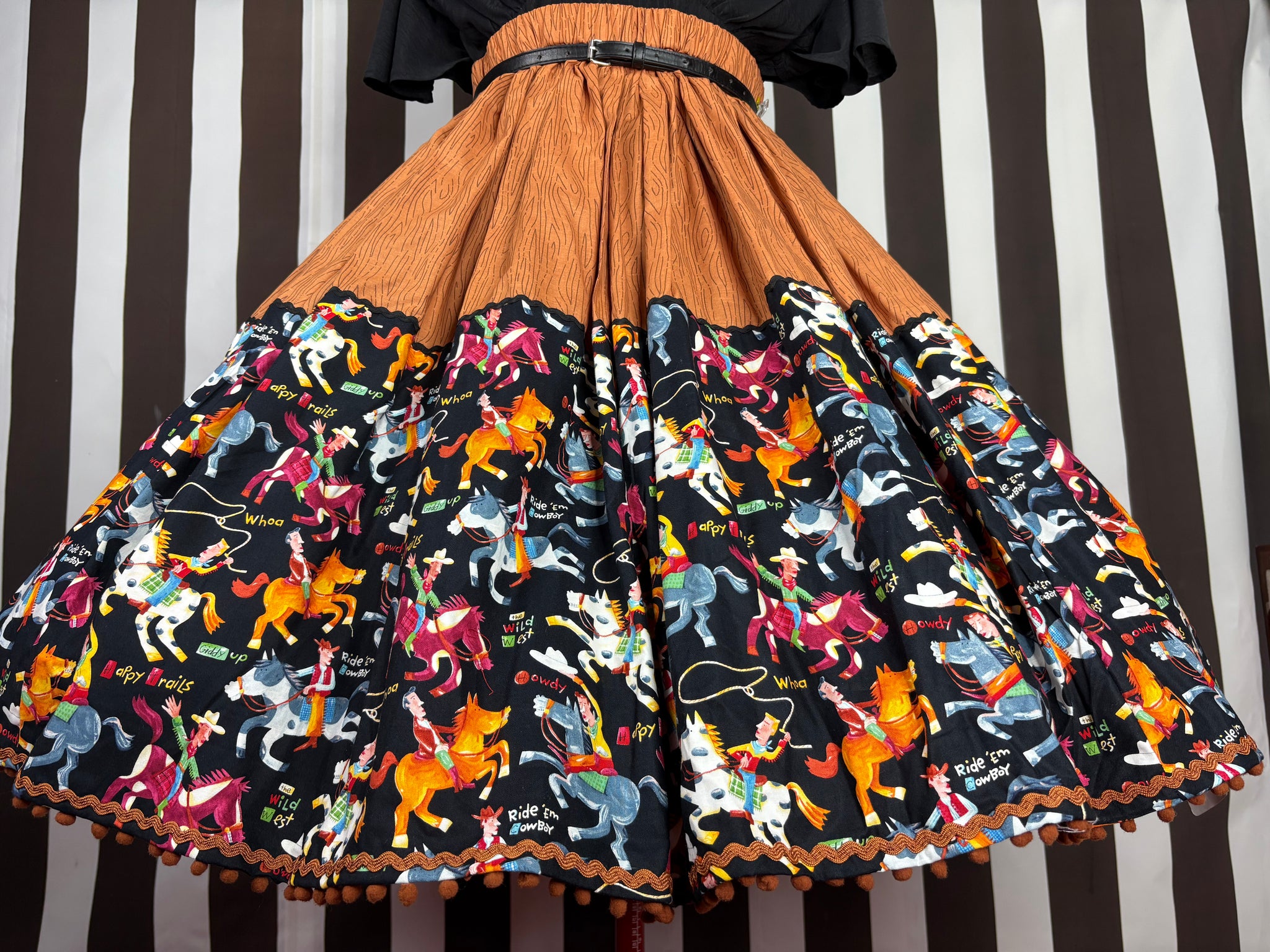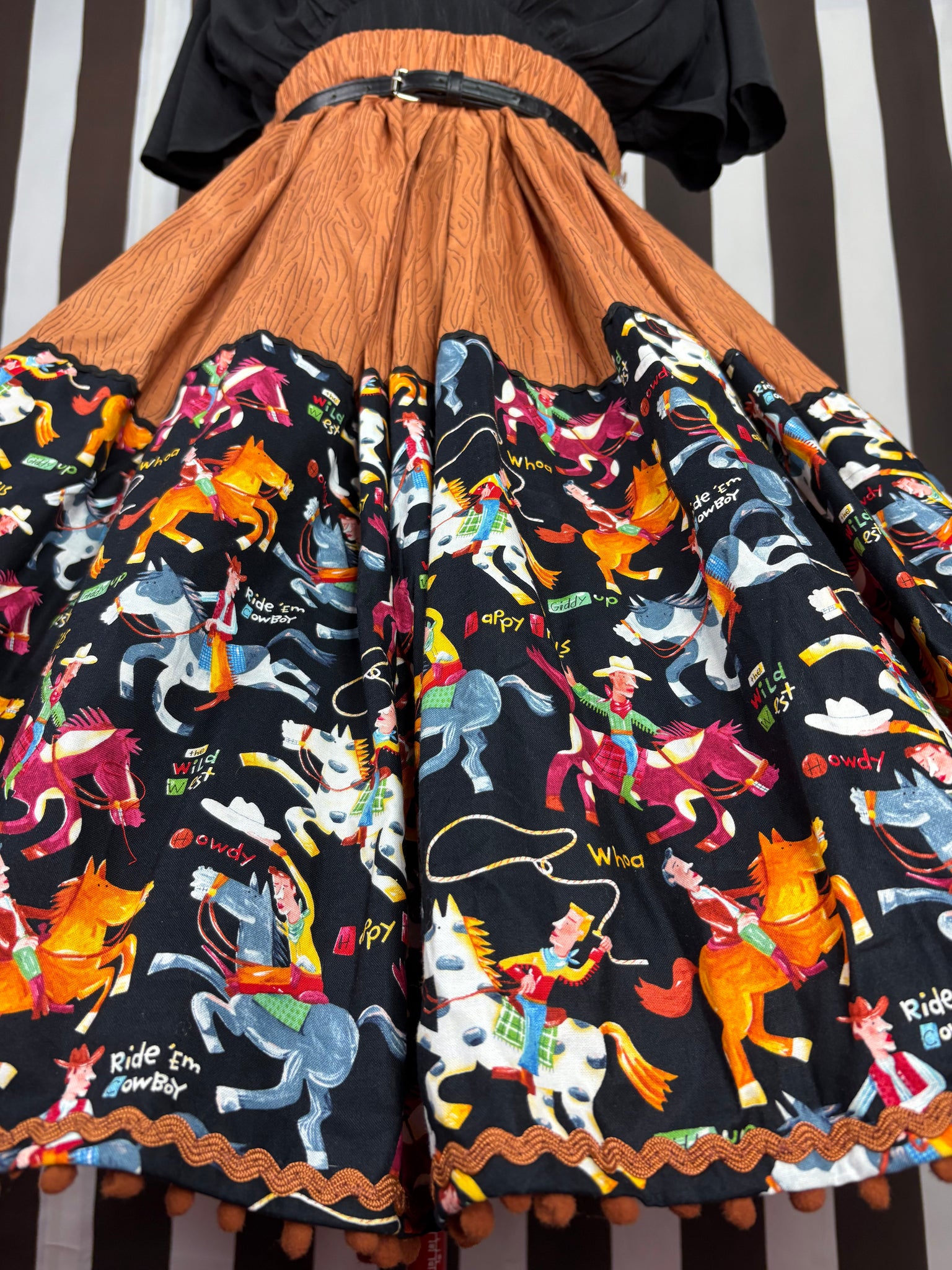 A quality 💯 out of print cotton fabric featuring carton like illustrations of cowboys on their horses with a black background & perfectly co ordinated brown wood print cotton fabric then finished off with black ric rac on the top boarder & a caramel ric rac and mini pom poms on the hemline!