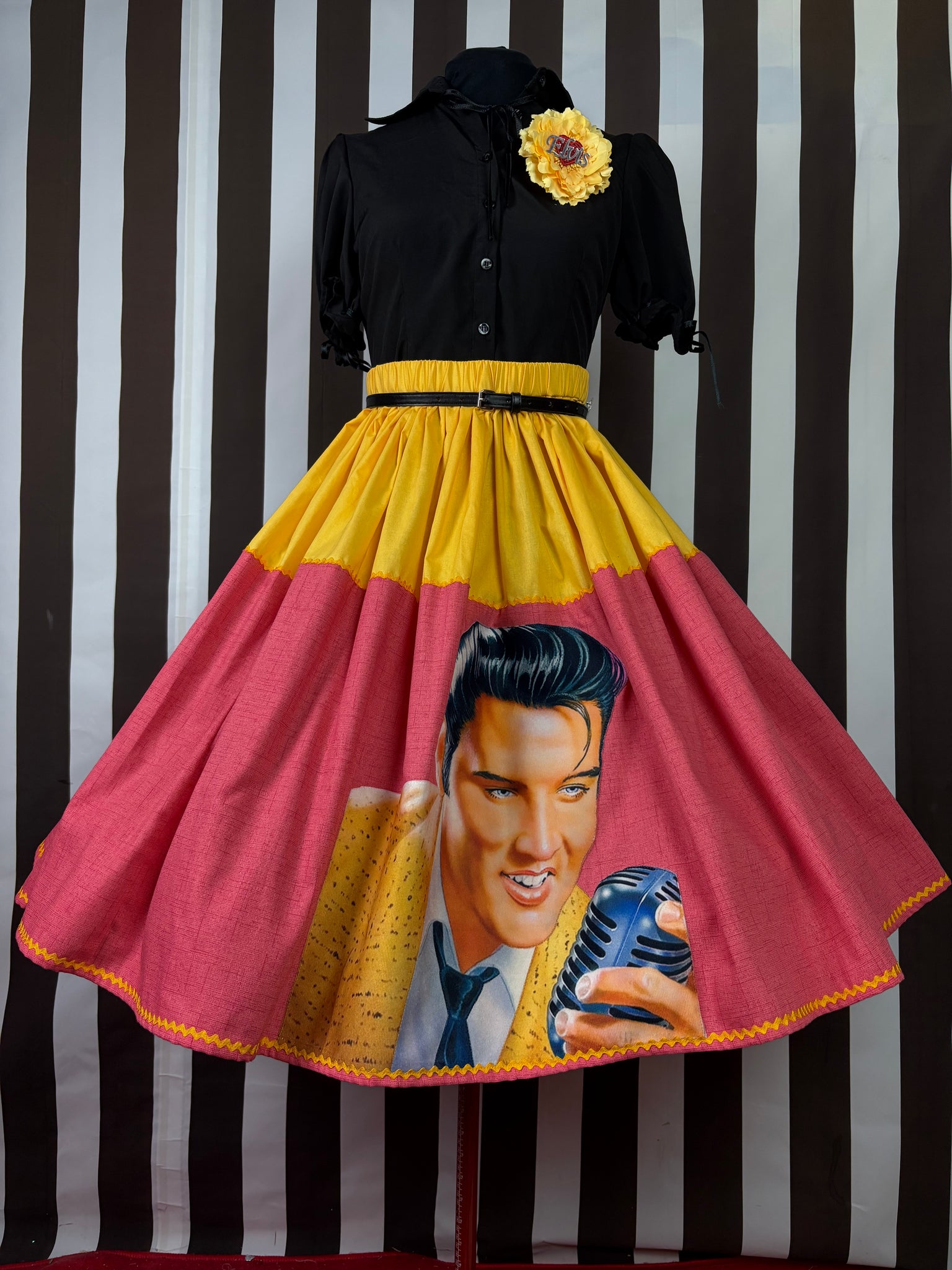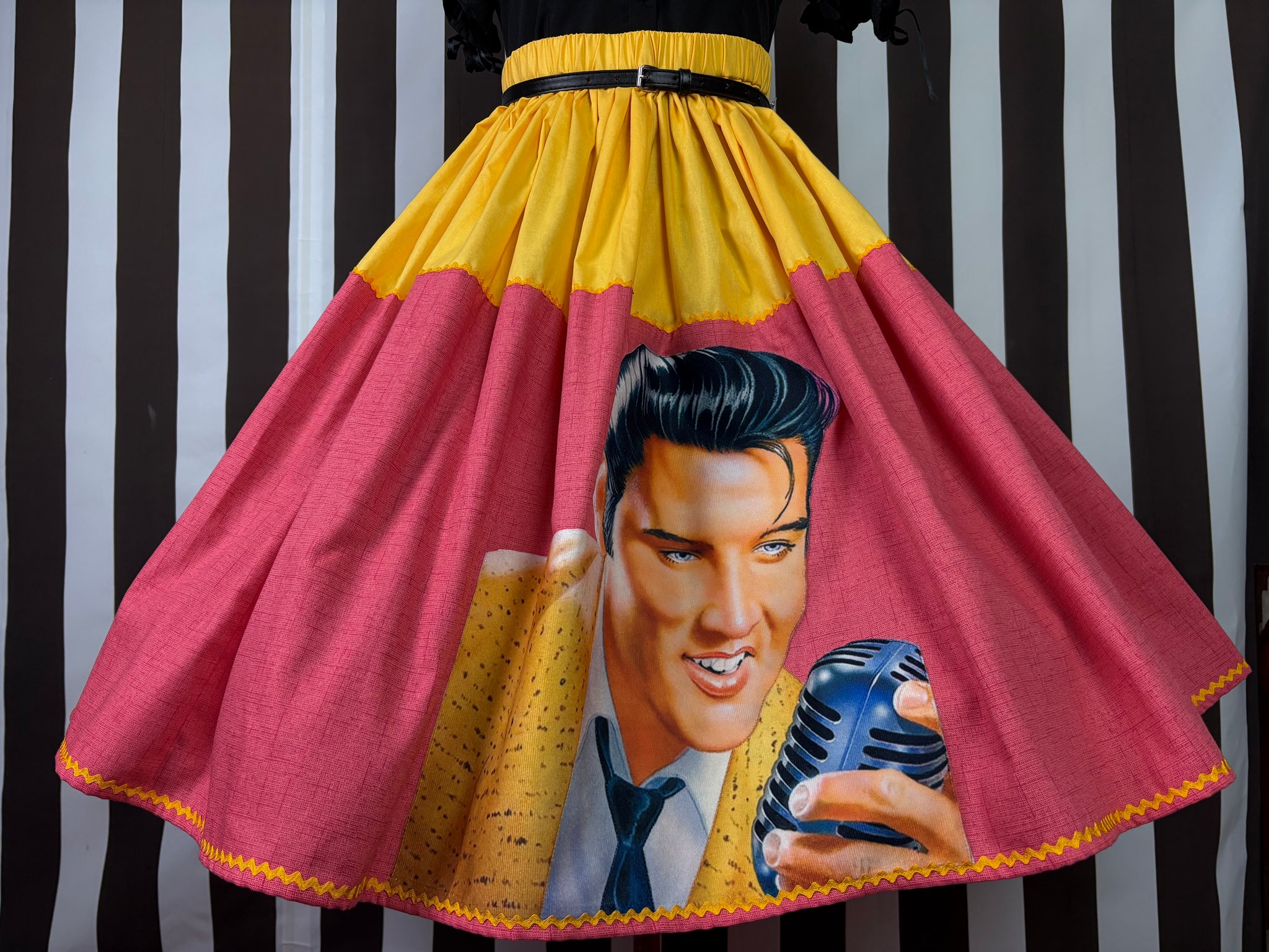 Celebrate the king of Rock’n’roll in this Elvis fan art inspired one of a kind skirt!!