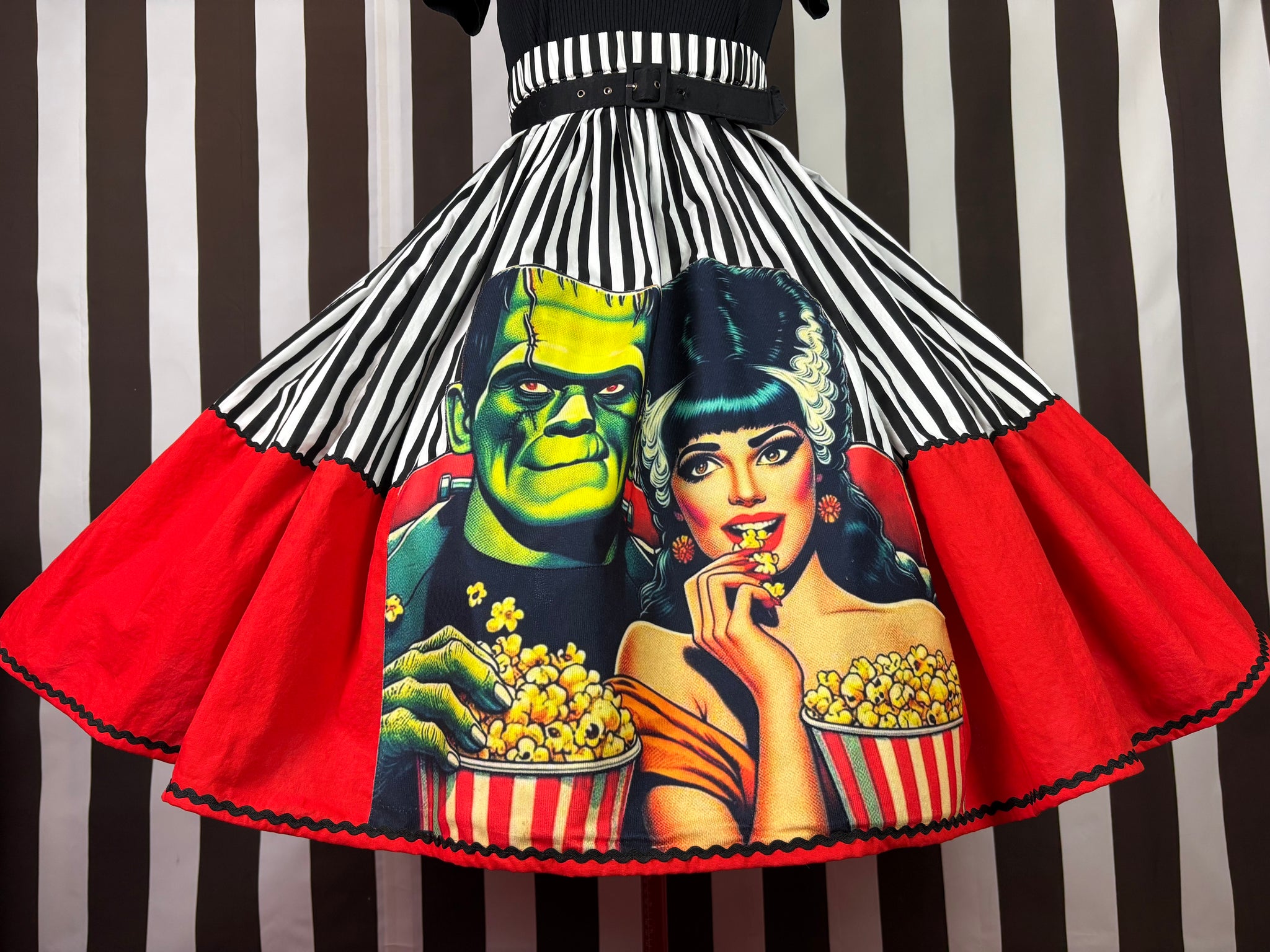 Your favourite Frankenstein and his bride in this one of a kind skirt!