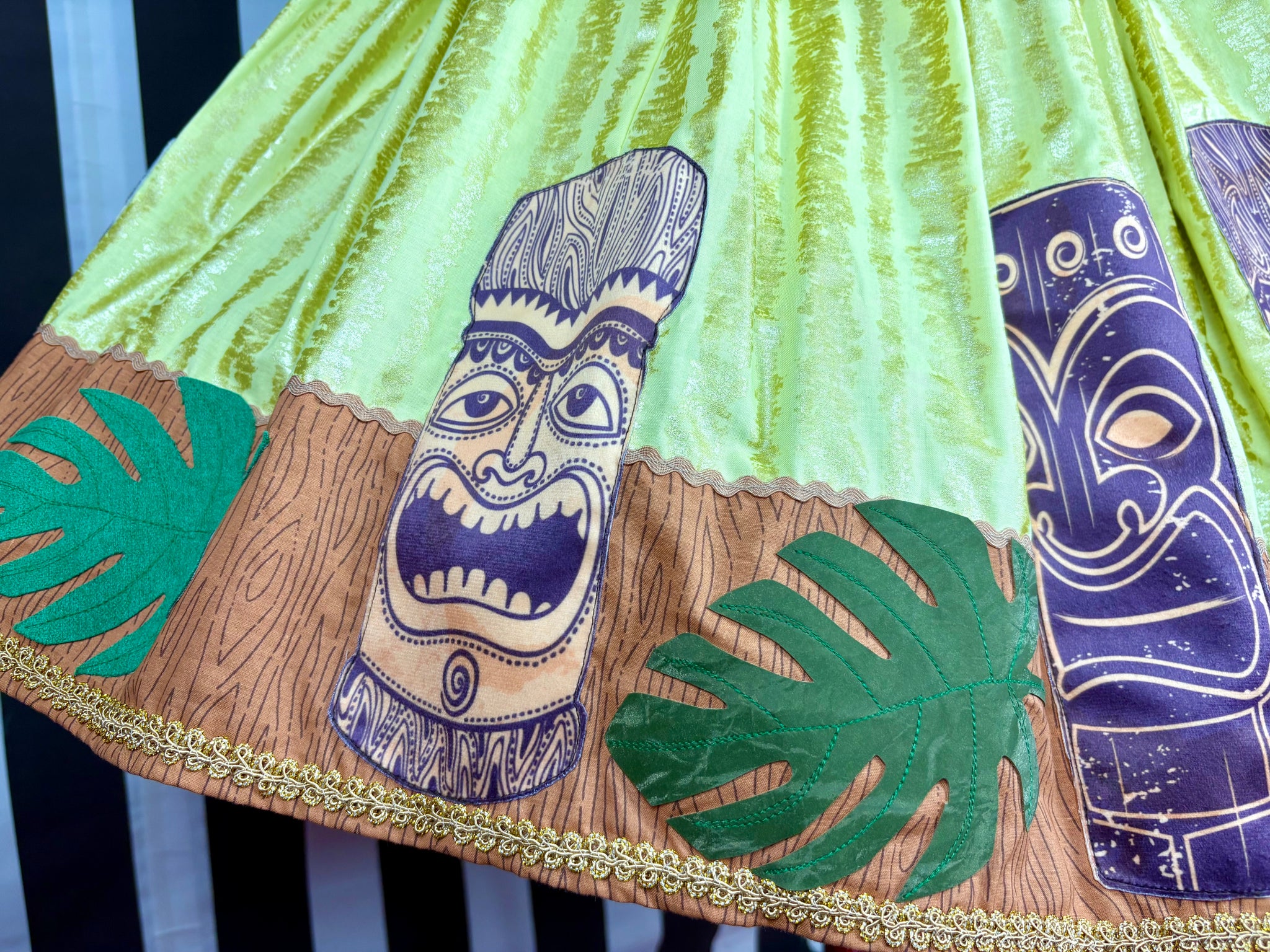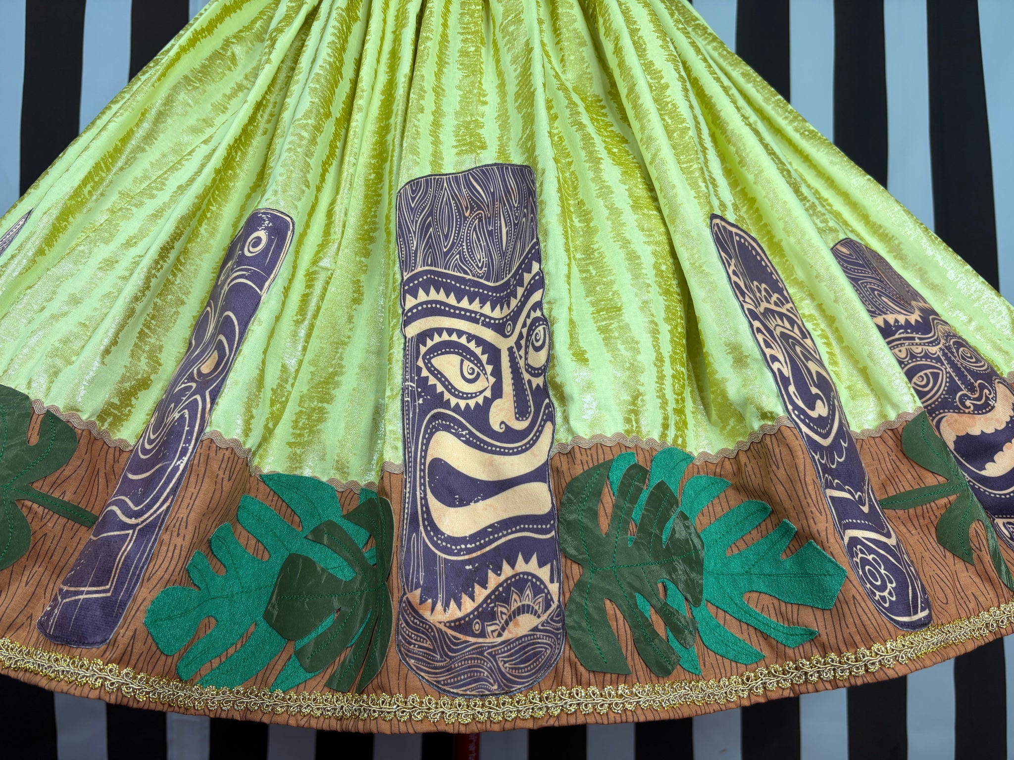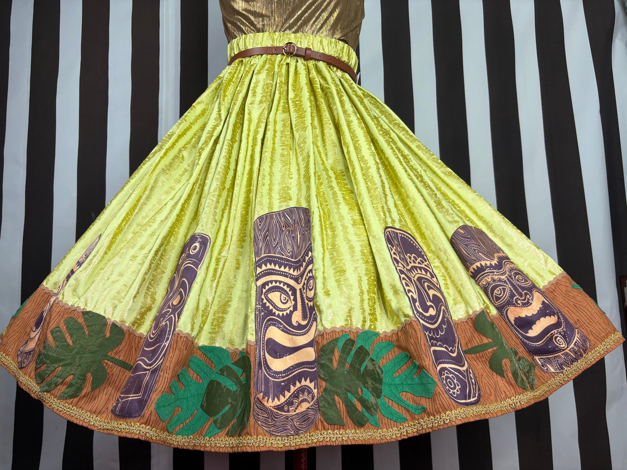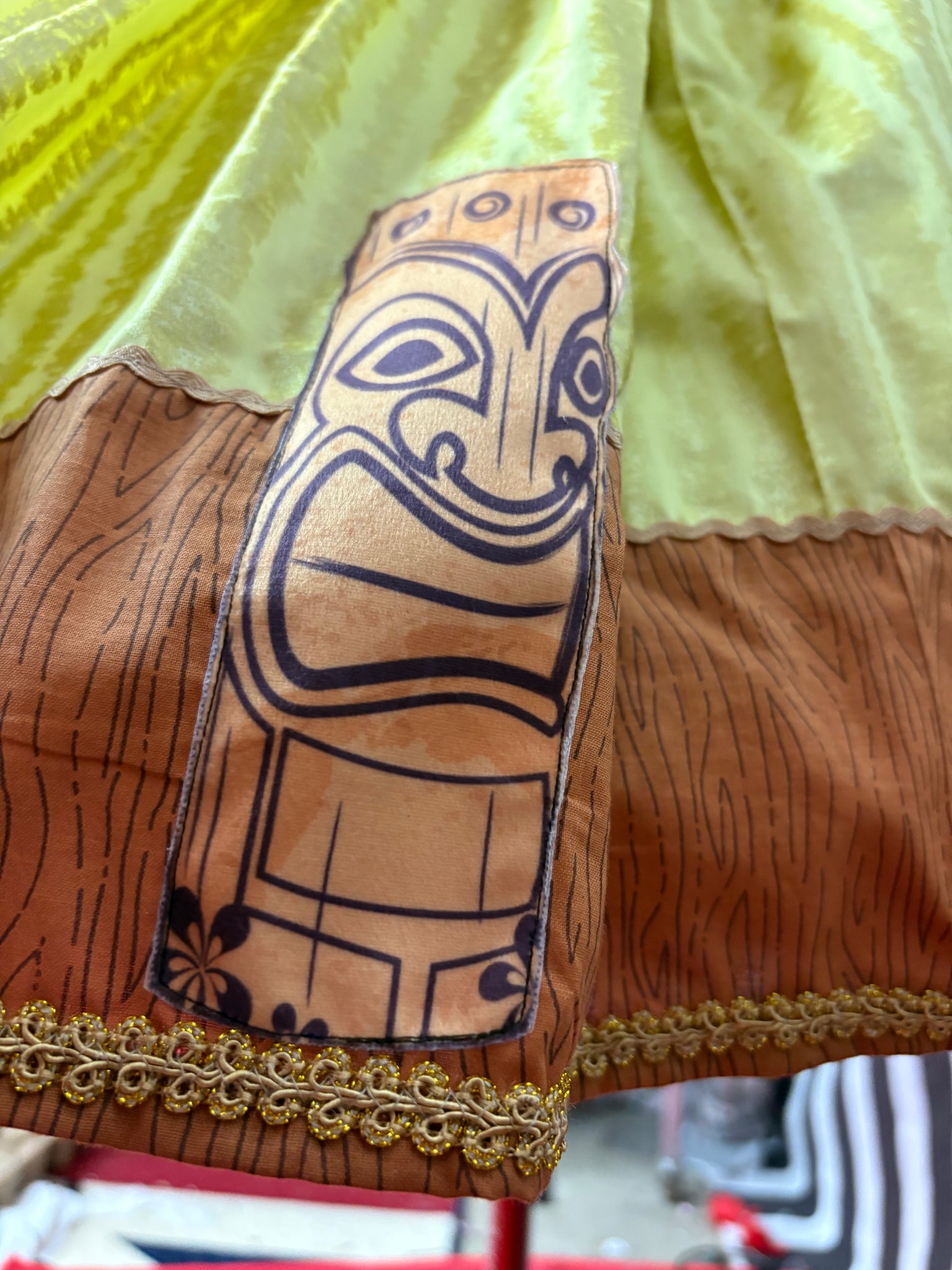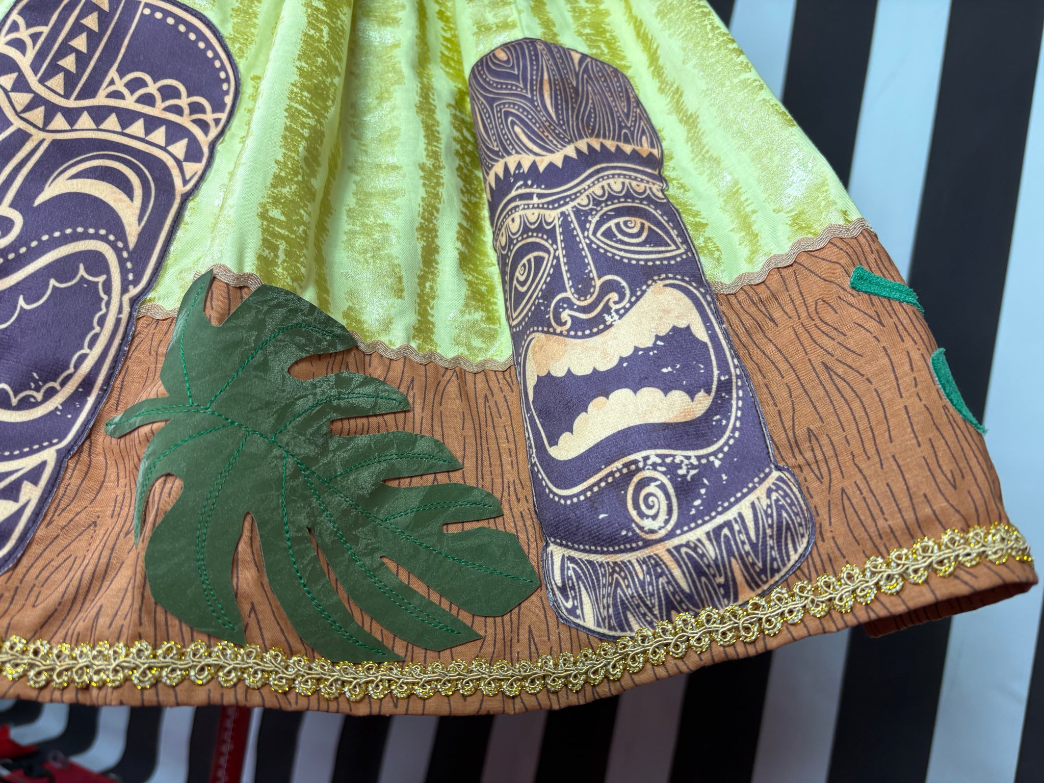 This 💯quality, batik cotton fabric has a superb metallic gold stripes feature on a citrus coloured background and  has been co ordinated perfectly with a wood print cotton fabric. The middle boarder has a caramel ric rac with the hemline surrounded by a gorgeous brocade gold trimming. And now for the feature, there is 8 tiki appliqués sewn in to place to give you that perfect tiki skirt and then there is faux suede leaves to finish it off!