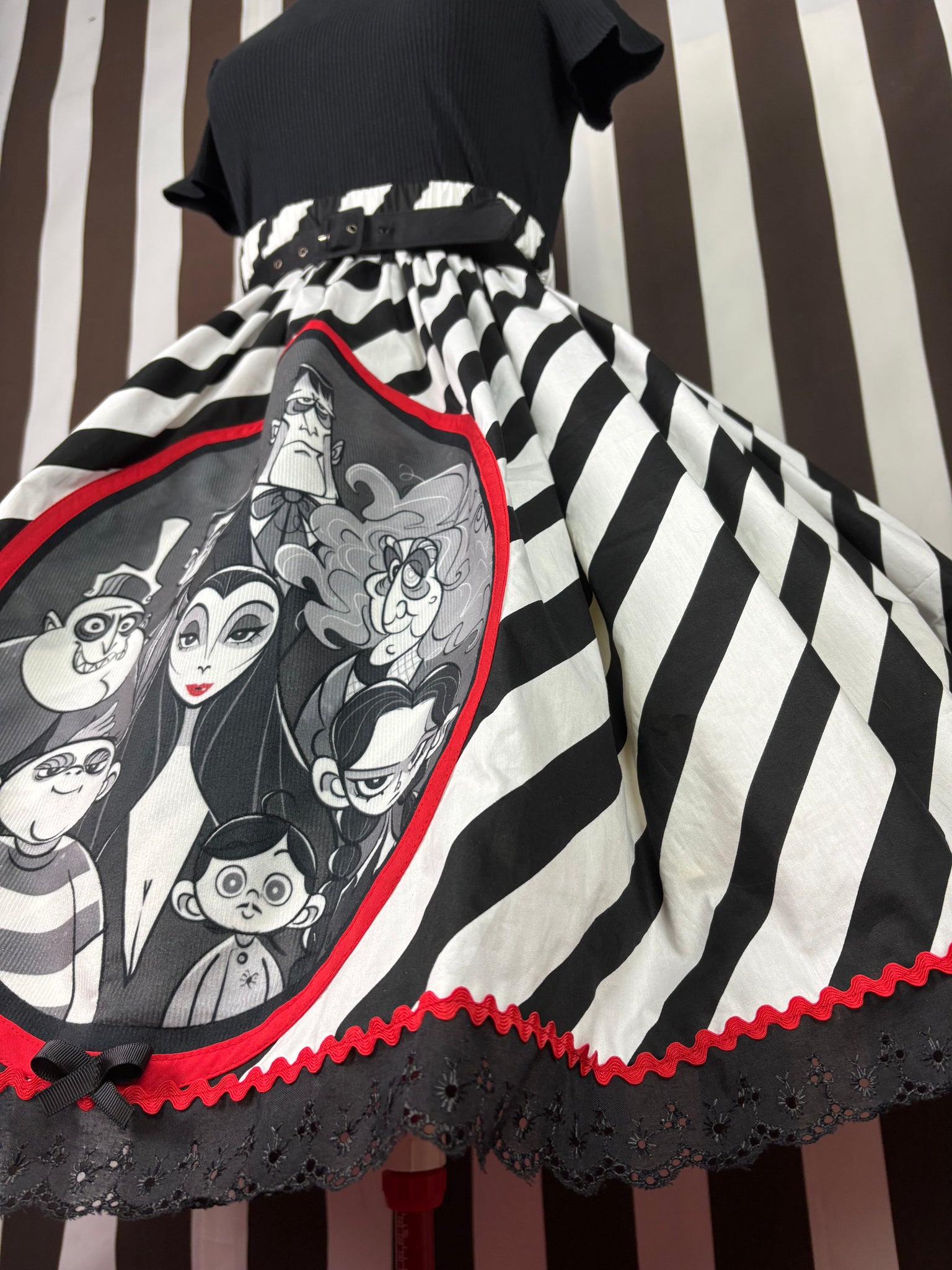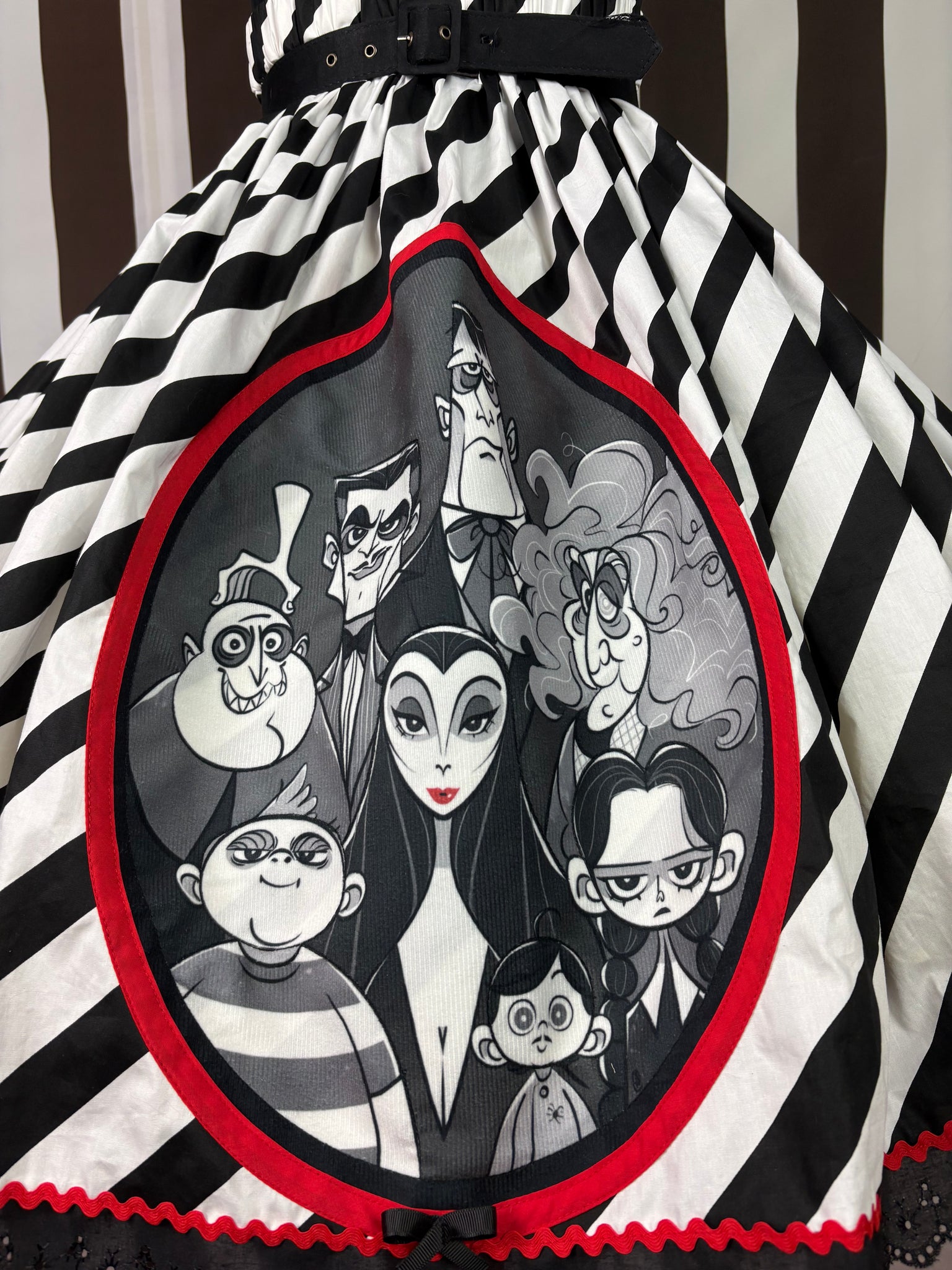 This handmade 💯cotton black and white stripe fabric base features a fabulous Adam’s family style portrait picture appliqué sewn into place and then surrounded by red ribbon to form the frame and a black bow on the bottom. The skirt is then finished up with a black broiderie anglaise hemline and red ric rac!