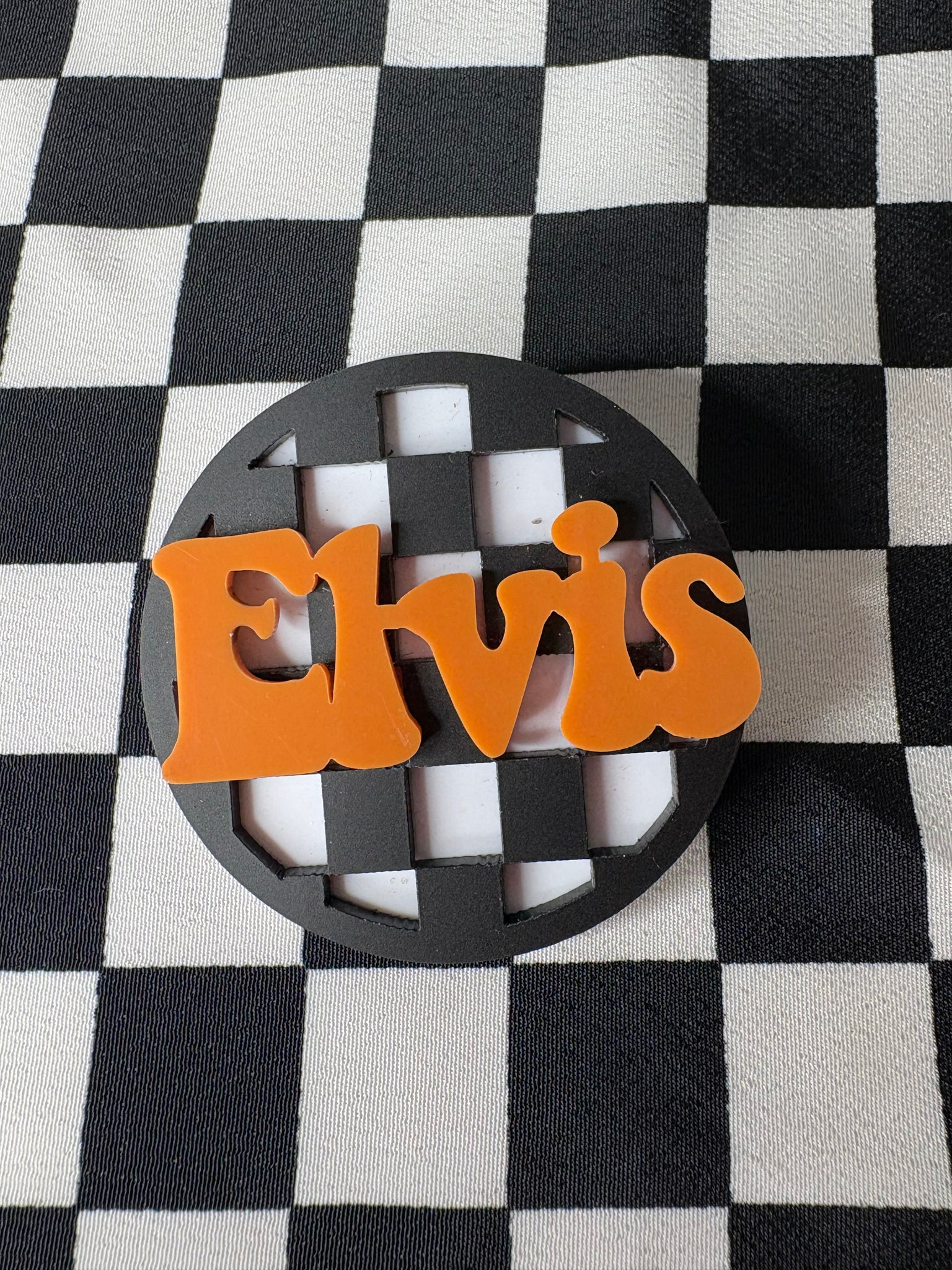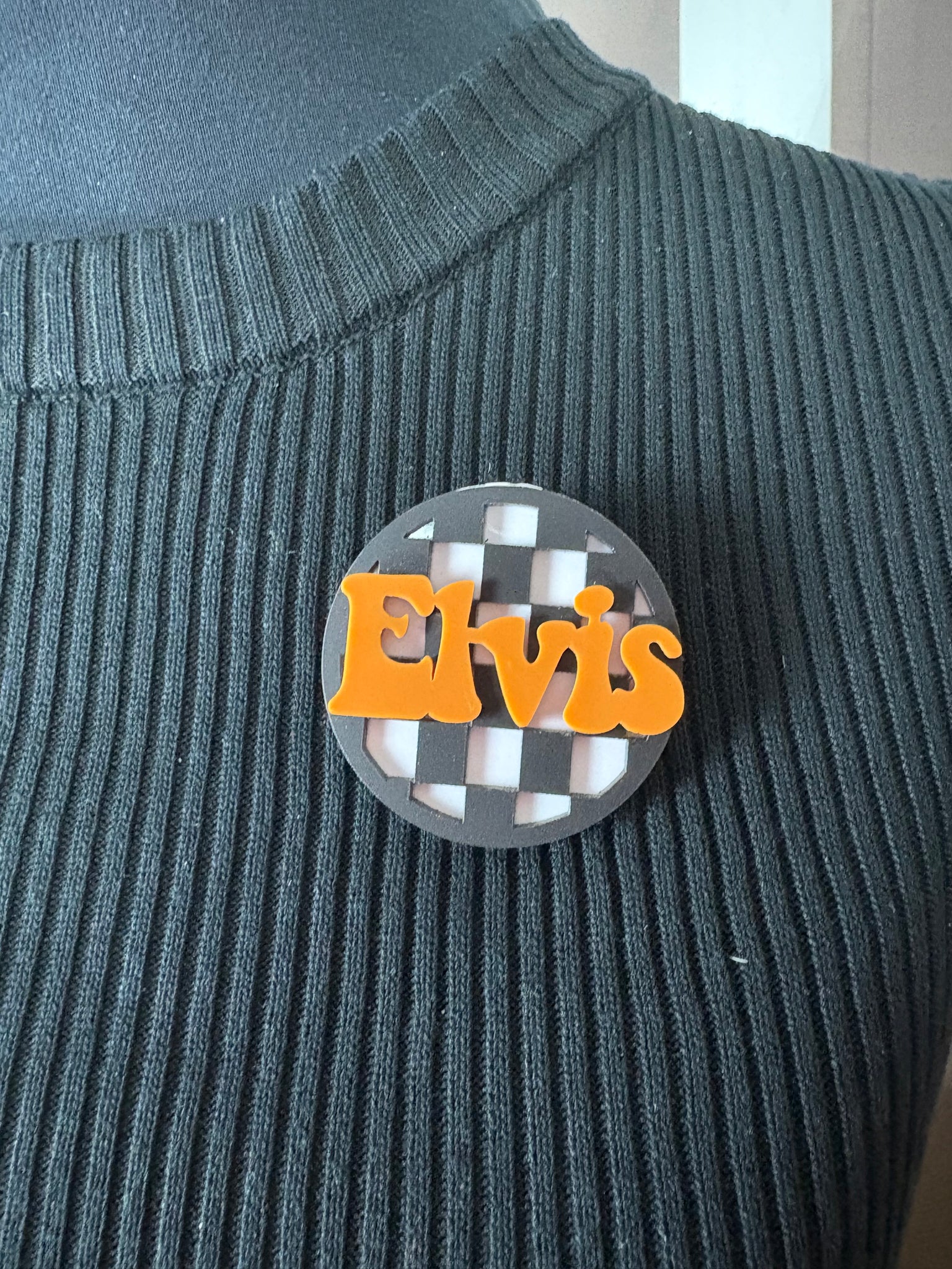 round black and white check brooch with the name ‘Elvis’ on it!