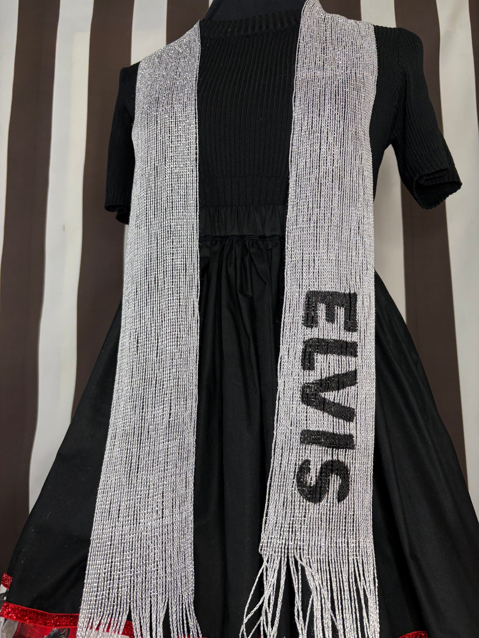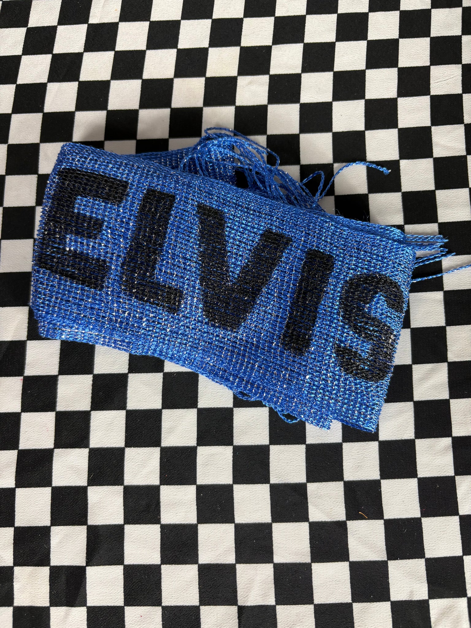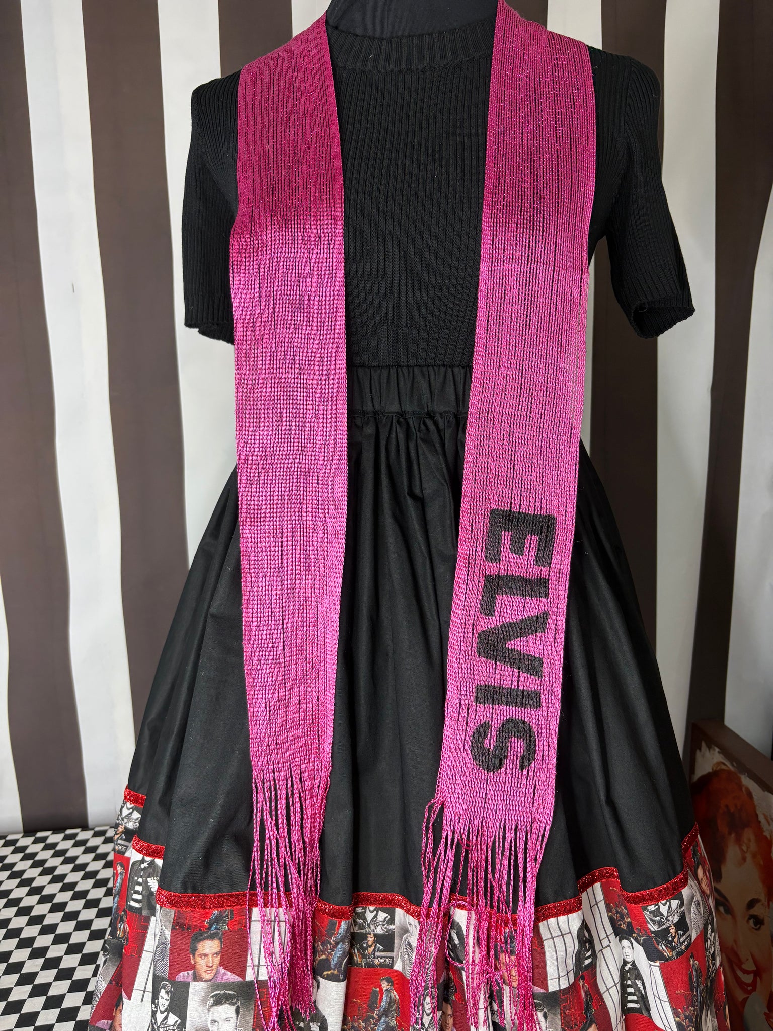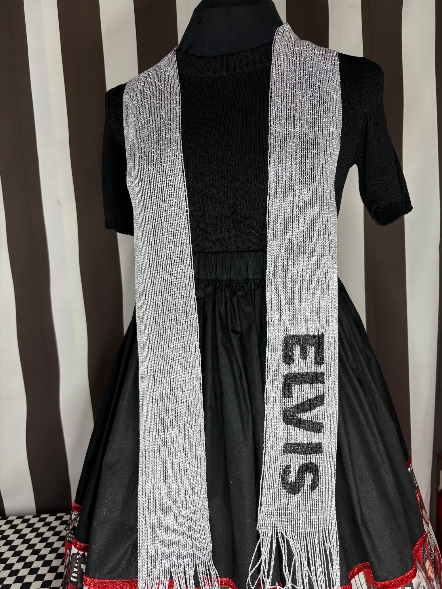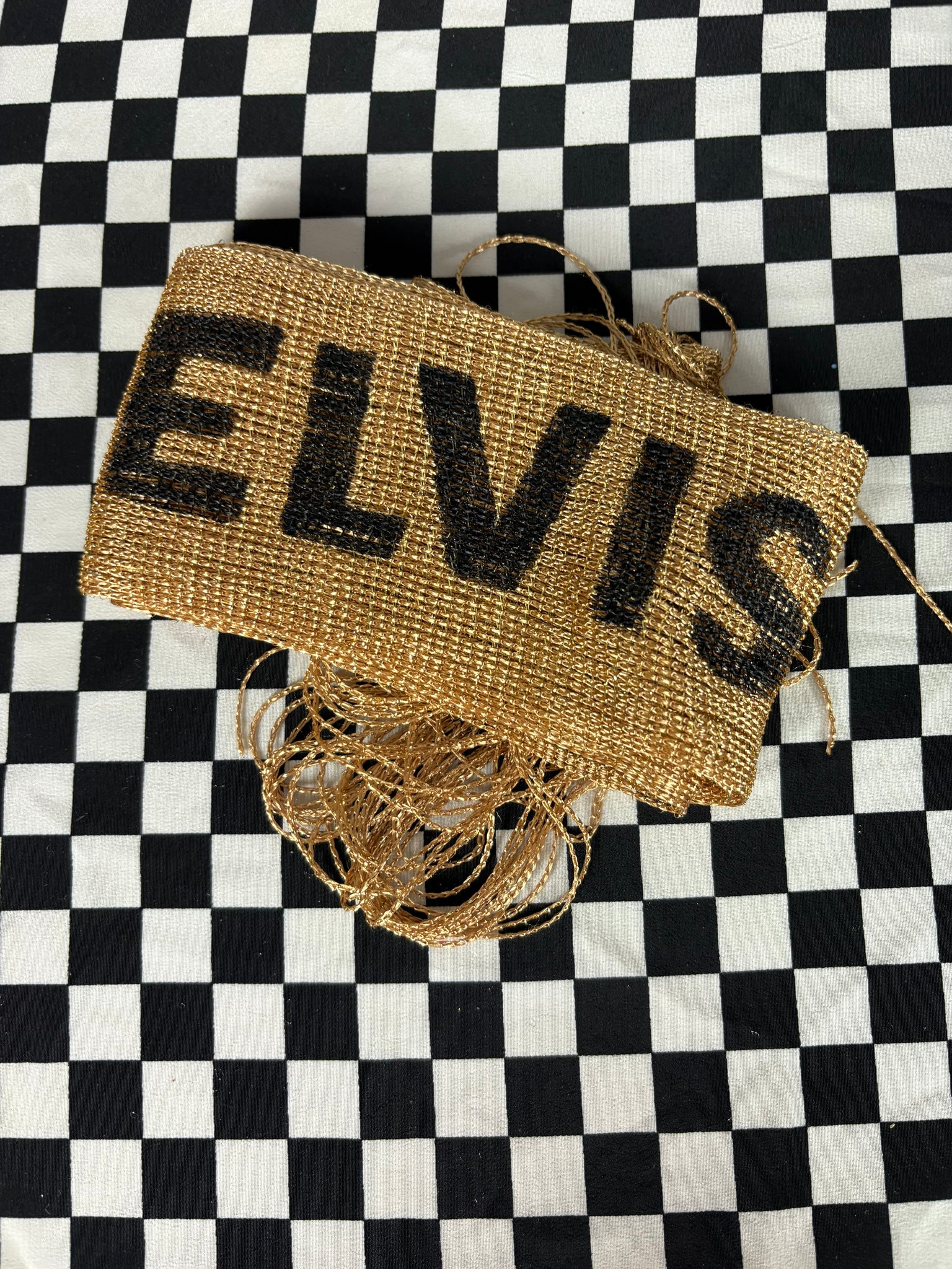 here you have beautiful metallic thread scarves that sparkle in the sun or under lights, with hand painted ‘elvis’ on them! The scarf measures around 9cm in width and 196cm in length including the tassels!