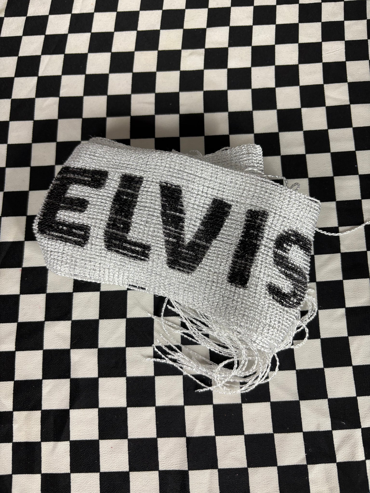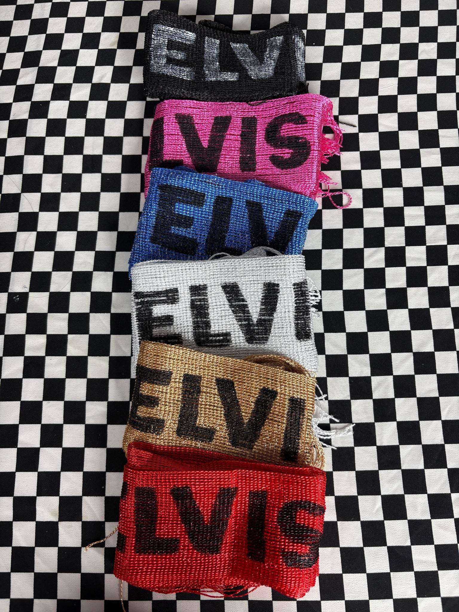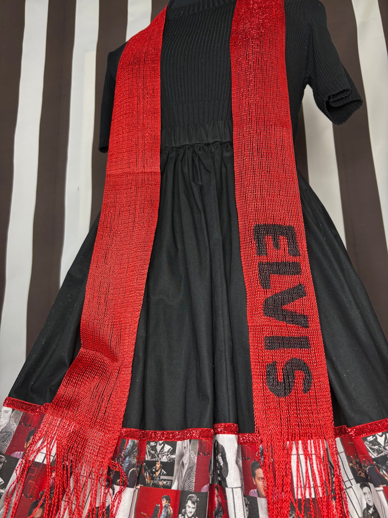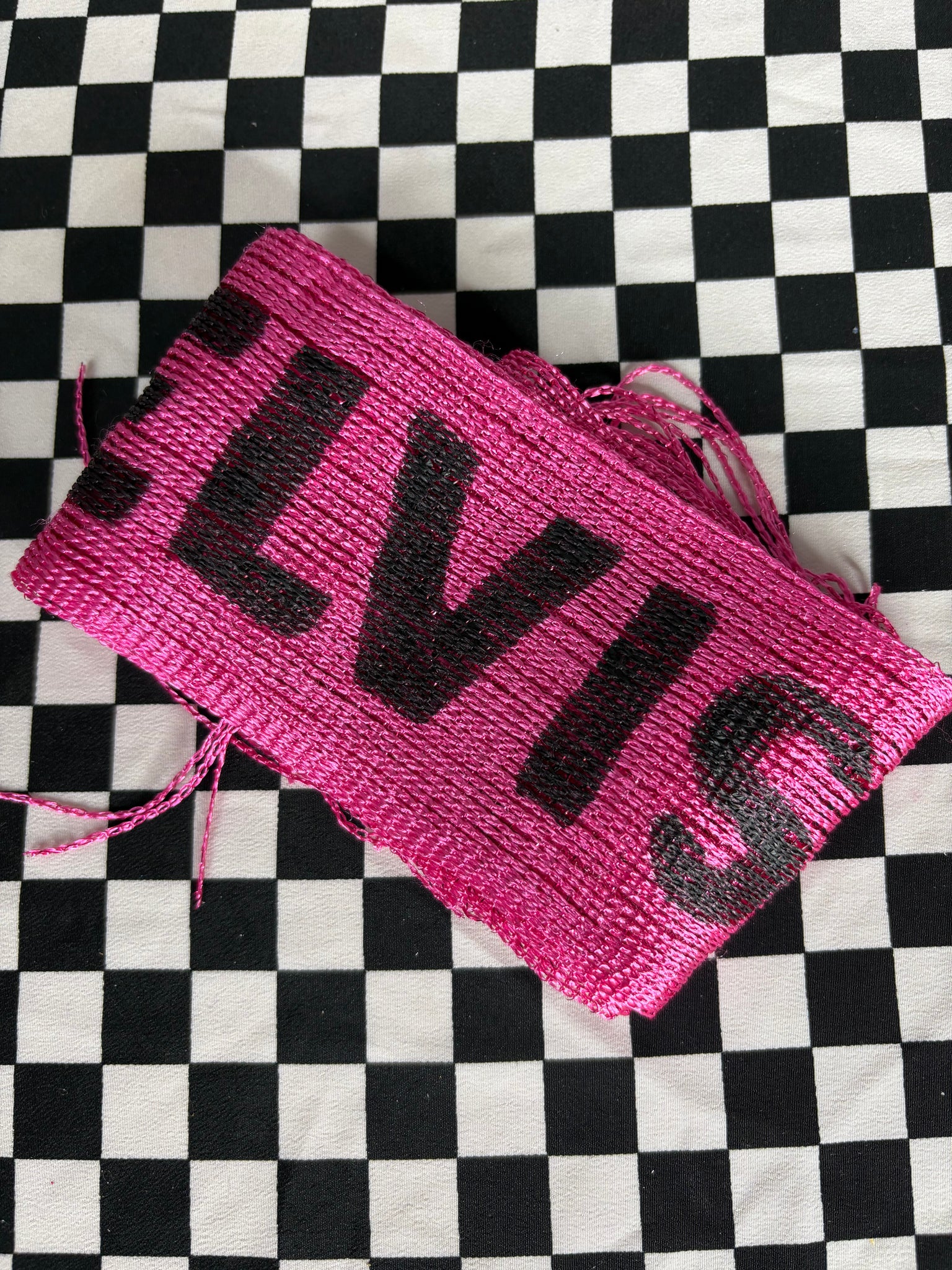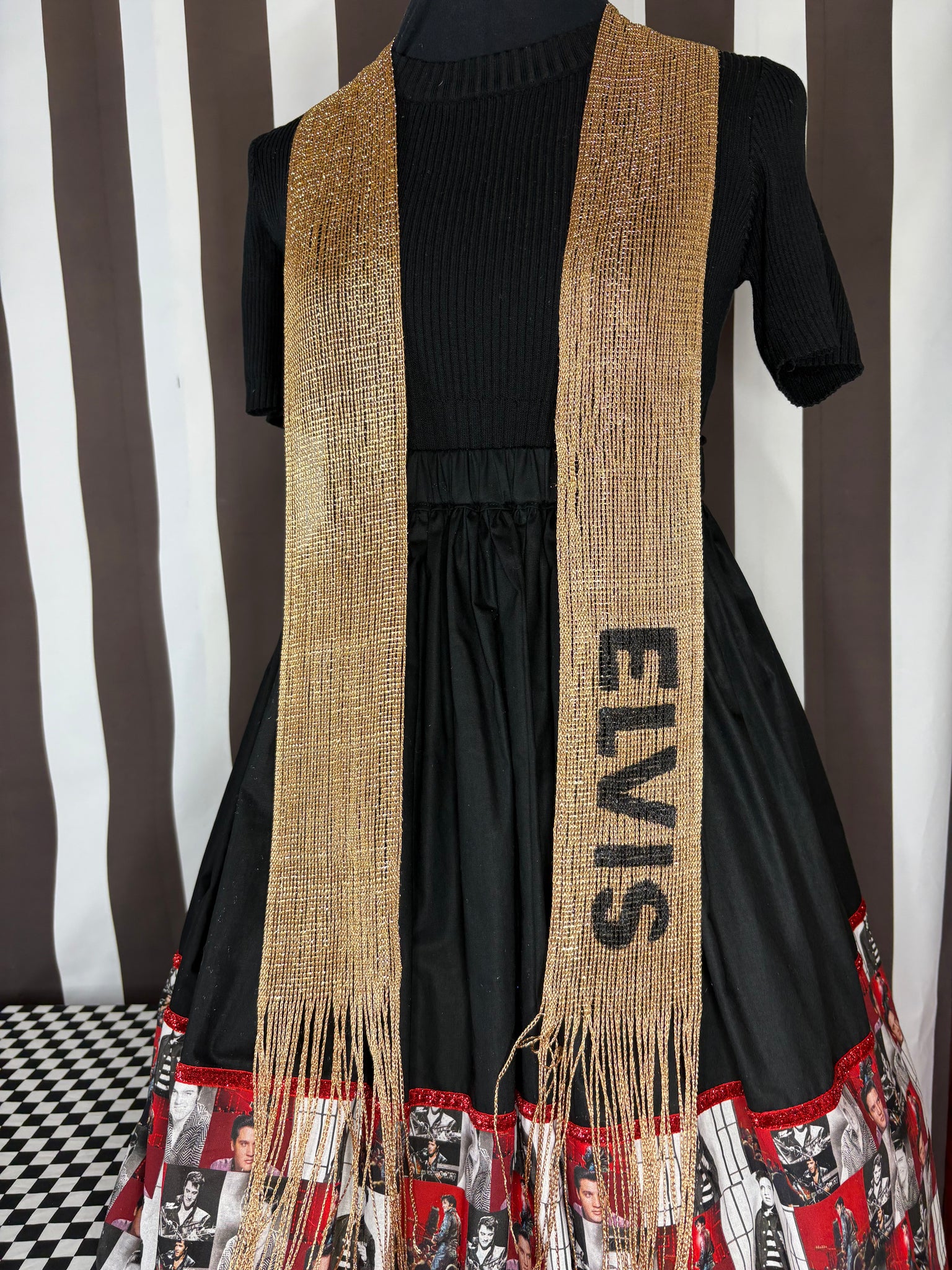 here you have beautiful metallic thread scarves that sparkle in the sun or under lights, with hand painted ‘elvis’ on them! The scarf measures around 9cm in width and 196cm in length including the tassels!