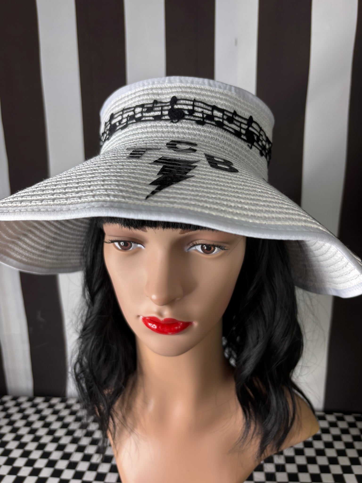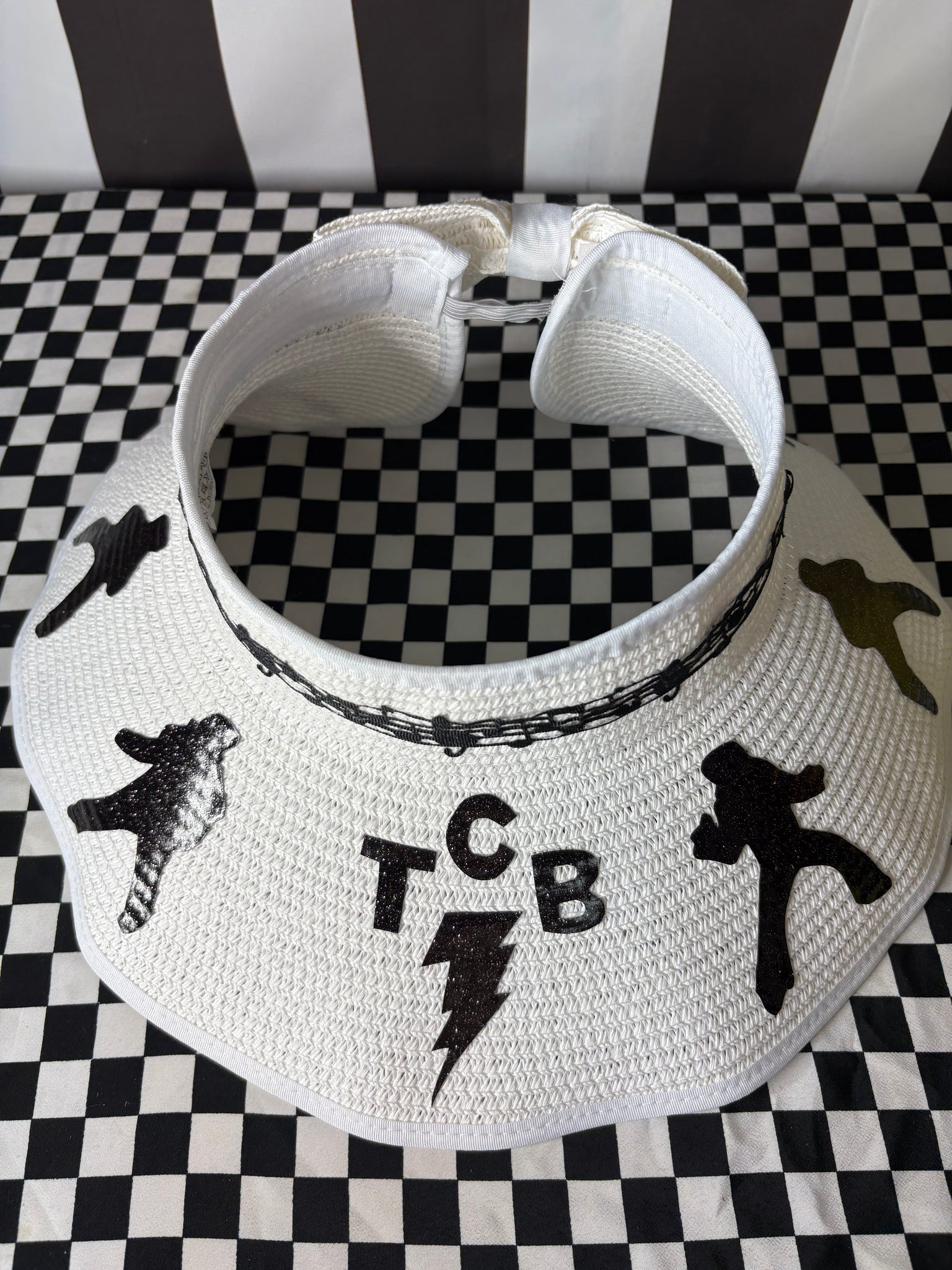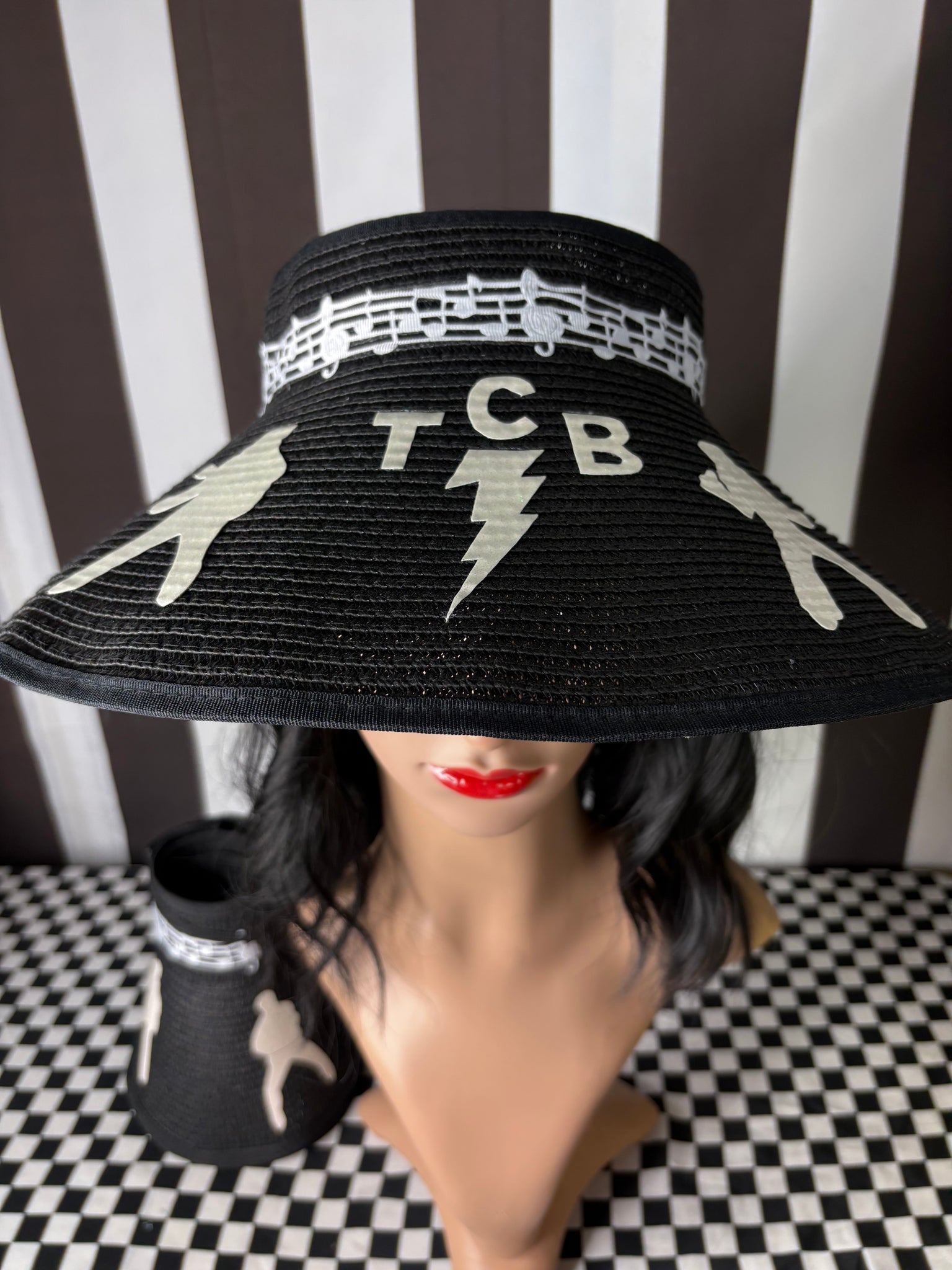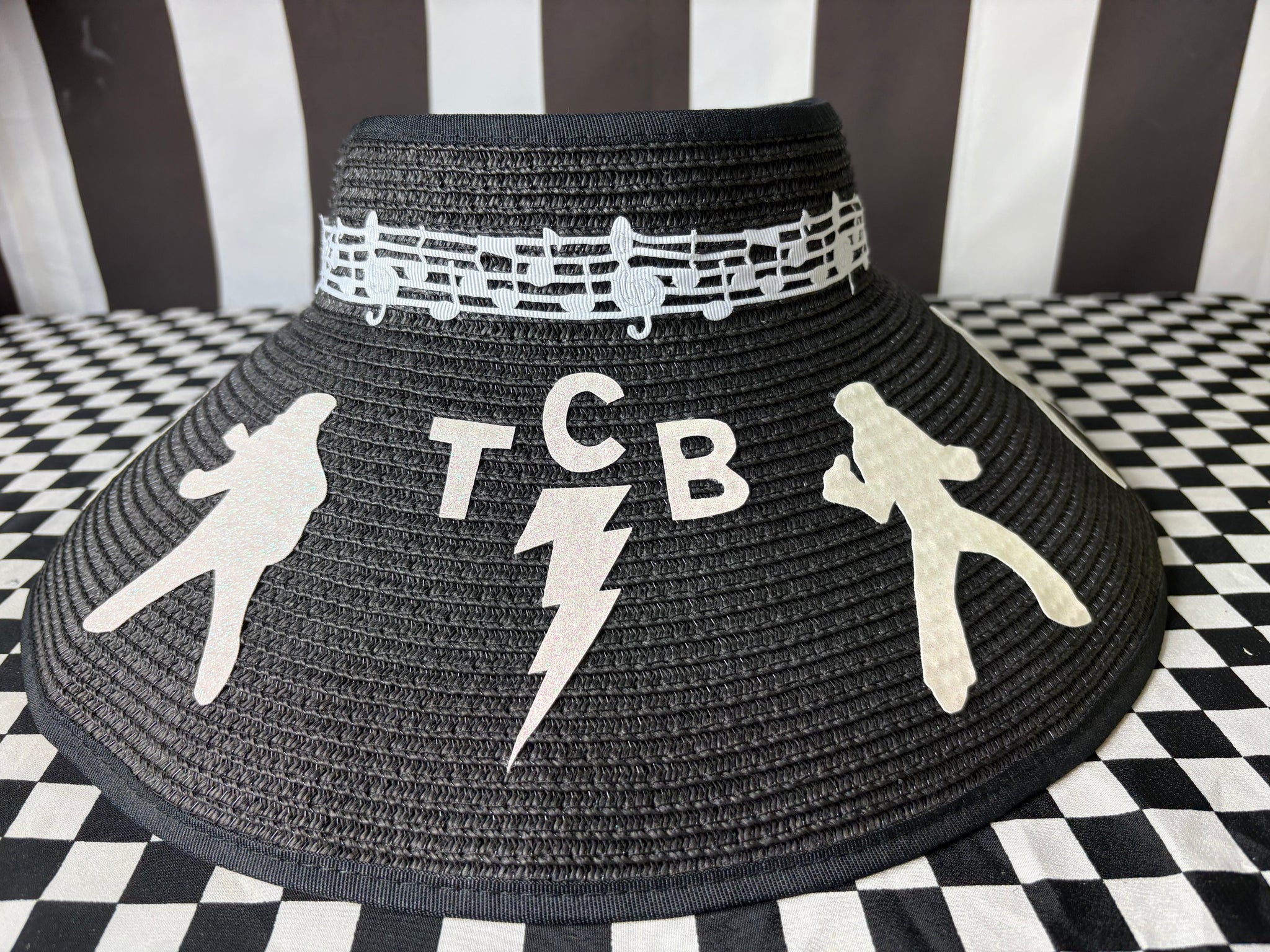 Made of 100% paper, these hats have a nice wide brim and open top featuring hand cut, glitter faux leather silhouettes of Elvis and his famous TCB. There is also a musical notes band around. This hat is adjustable in size and will fit any women’s head! It can also be rolled up for storage!