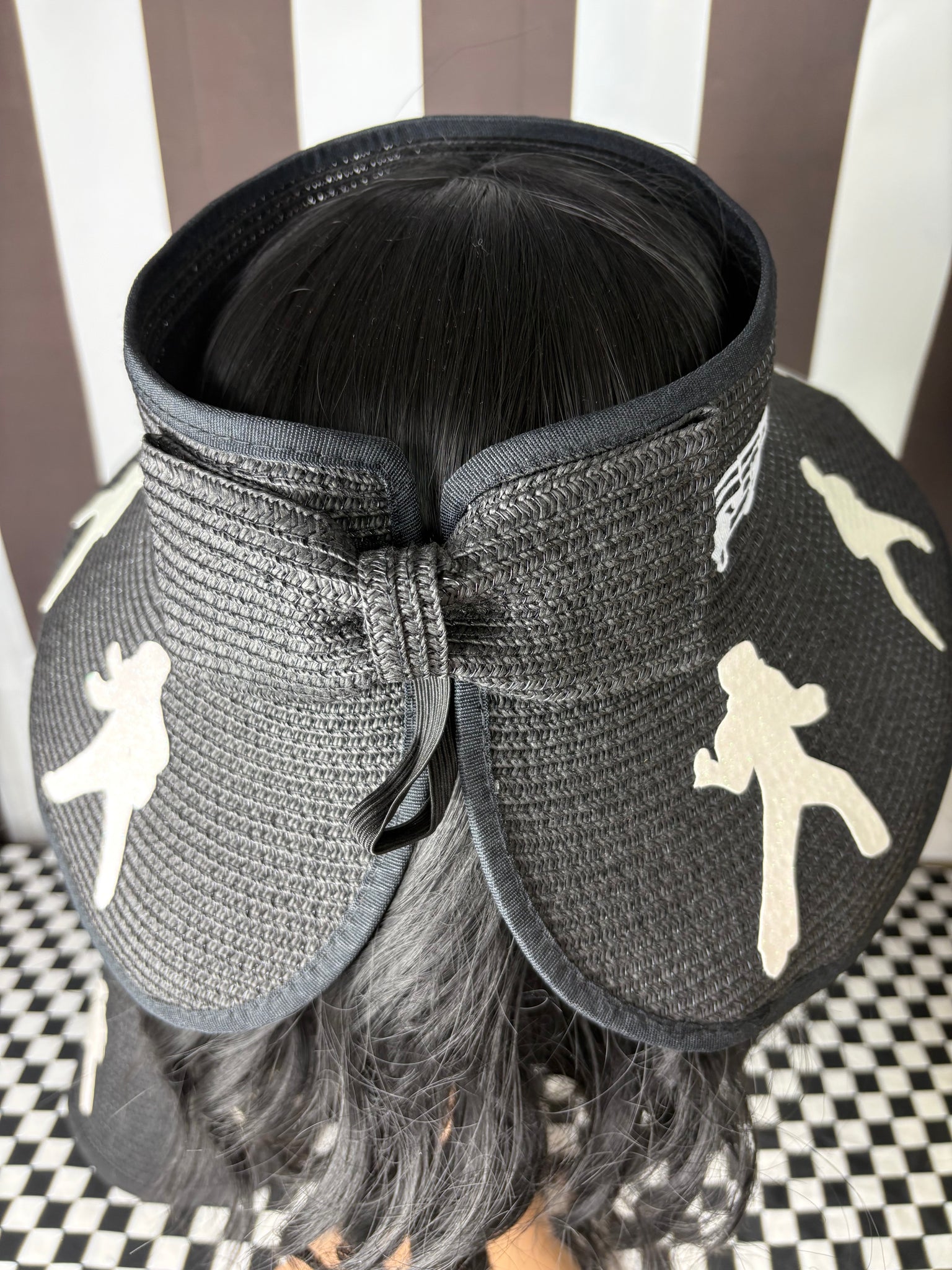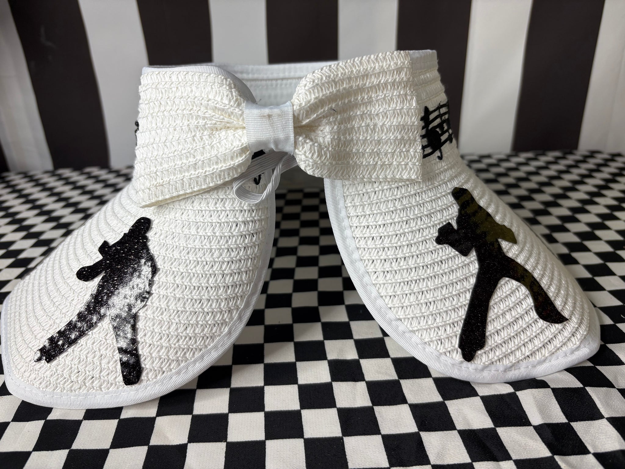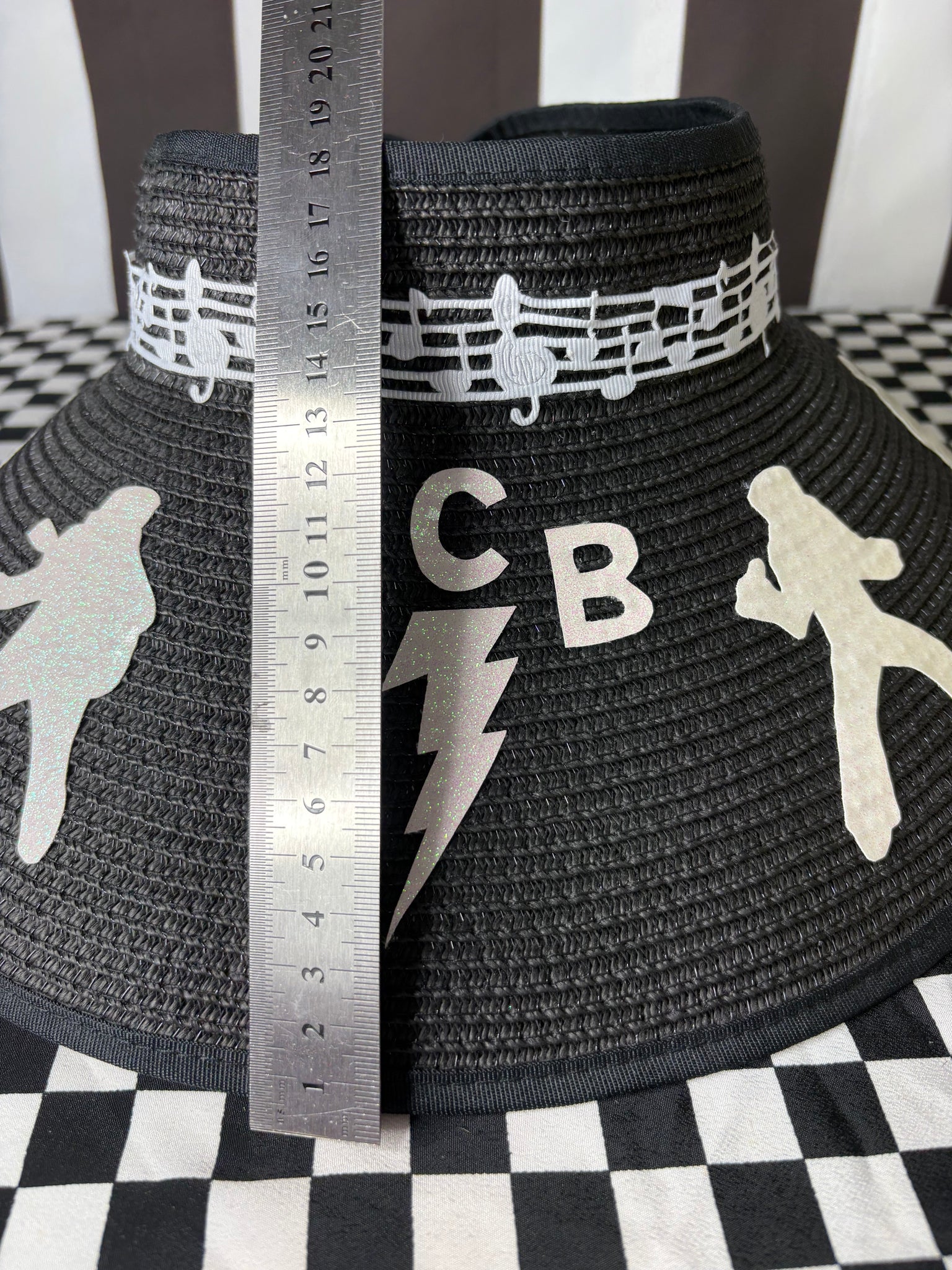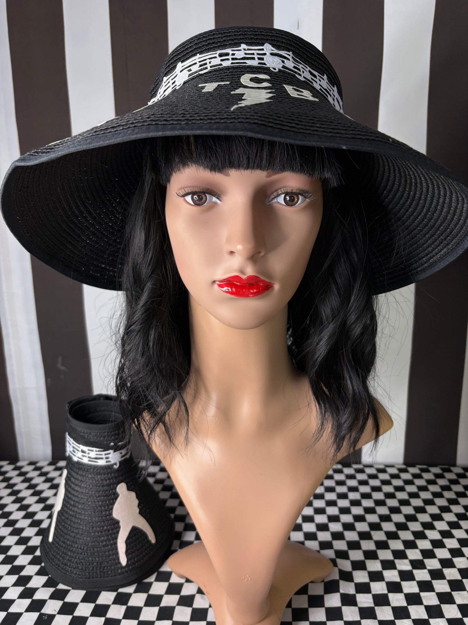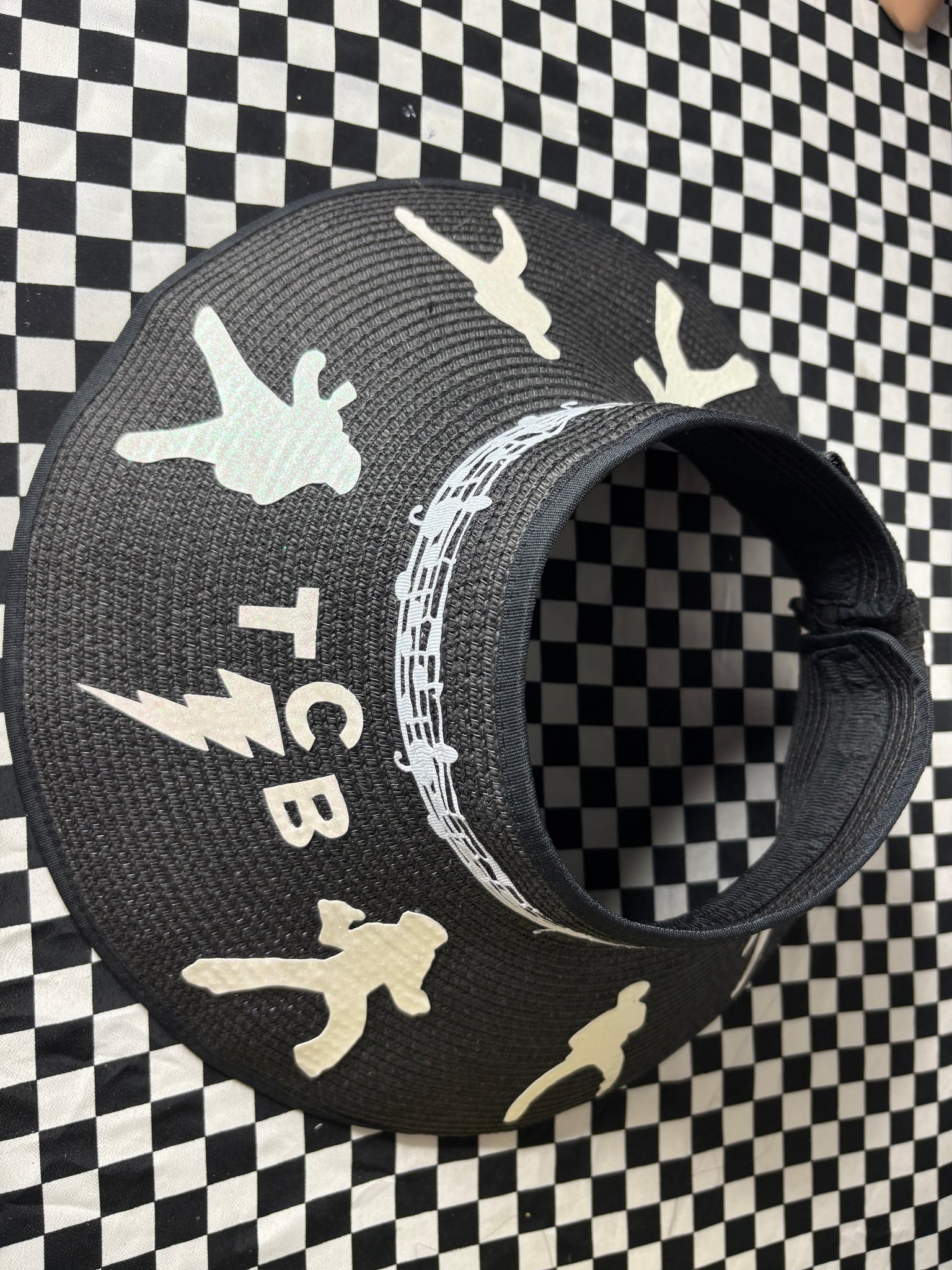 Made of 100% paper, these hats have a nice wide brim and open top featuring hand cut, glitter faux leather silhouettes of Elvis and his famous TCB. There is also a musical notes band around. This hat is adjustable in size and will fit any women’s head! It can also be rolled up for storage!